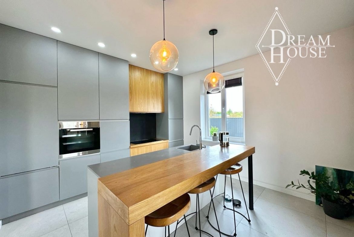 ✔️На першому поверсі будинку розміщений великий передпокій з місткою гардеробною шафою та виходом у гараж, велика вітальня з обідньою зоною з панорамними вікнами каміном та плавним переходом у зону кухні, яка візуально відмежована від гостьової. На кухні розташований робочий острівок з умивальником та барною зоною, кухонний гарнітур у мінімалістичному стилі з вбудованою технікою. З кухні є вихід на терасу, з якої відкриваються гарні просторі краєвиди. Біля тераси, позаду будинку є зона BBQ. Також на першому поверсі розташована вбиральня з тропічним душем, спальна кімнатна та підсобна кімната, яка є пральнею та котловою. По першому поверсі у спільній та вітальній покладено ламінат, у передпокої, вбиральні та кухні покладено плитку з водяним підігрівом підлоги. Стелі – натяжні.